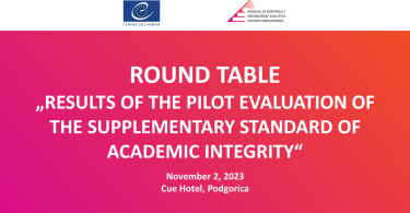 Agency for control and quality assurance of higher education and the program office of the Council of Europe in Podgorica are organizing a round table “Results of the pilot evaluation of the supplementary standard of academic integrity”. The round table will be held on Thursday...